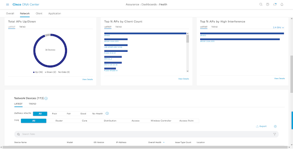 Get an overview of the health of the network and network devices. Information